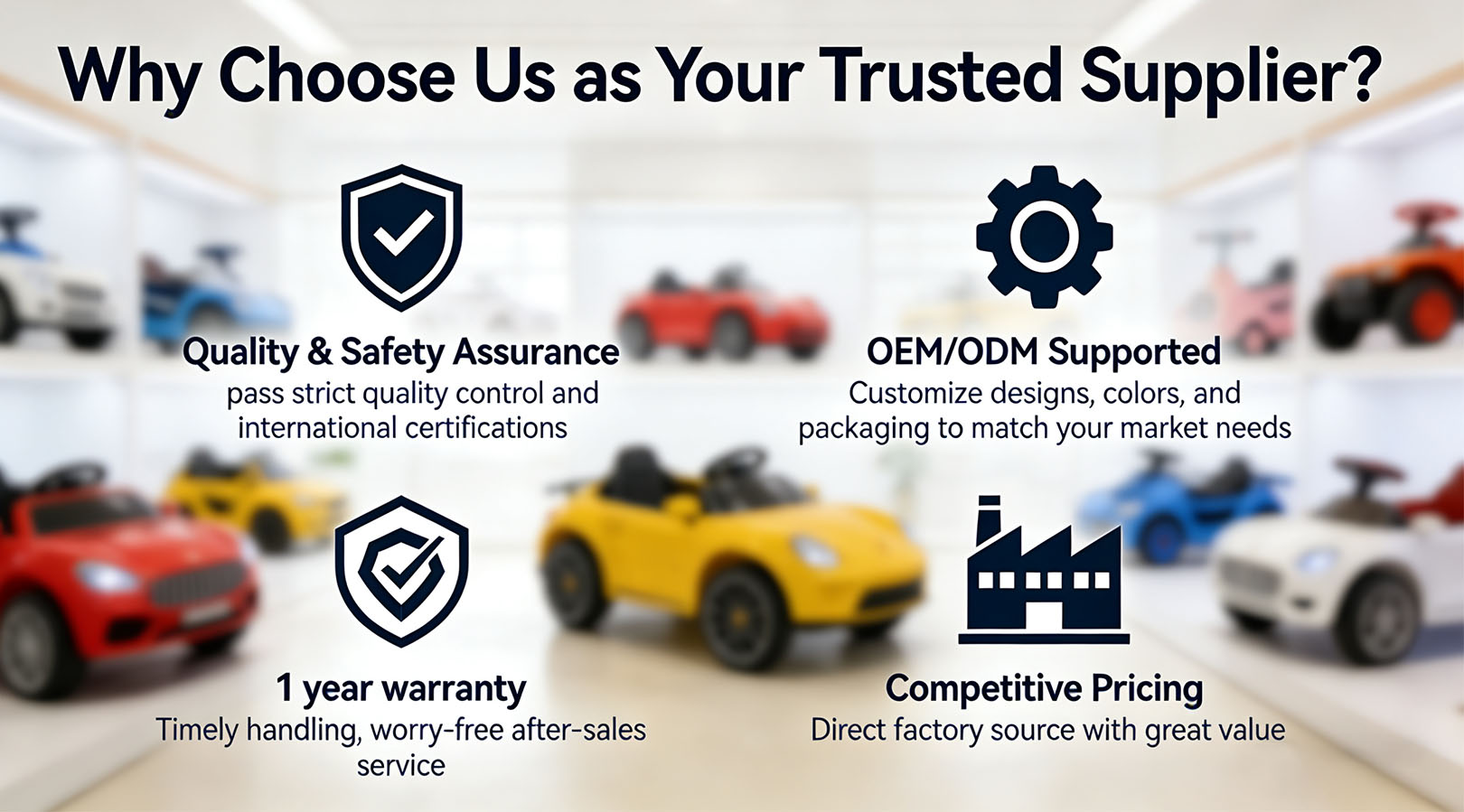 За прошедшие десятилетия компания Tusi Toys за последние 12 лет стала отличным поставщиком и экспортером детских товаров в Китае. В нашем ассортименте представлены различные виды детских электромобилей, в том числе электромобили, электромотоциклы, электрические коляски и другие серии, которые предназначены для удовлетворения различных потребностей детей разного возраста. Мы строго контролируем качество каждого звена: от выбора продукта, надзора за производством до проверки перед поставкой, соблюдая международные сертификаты качества и безопасности, такие как CE, EN71, ASTM F963, чтобы гарантировать, что каждый продукт, покидающий завод, является безопасным, долговечным и экологически чистым.